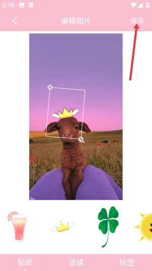 4、在【编辑相片】页面添加贴纸等效果后,点击右上角【保存】,完成相片编辑。