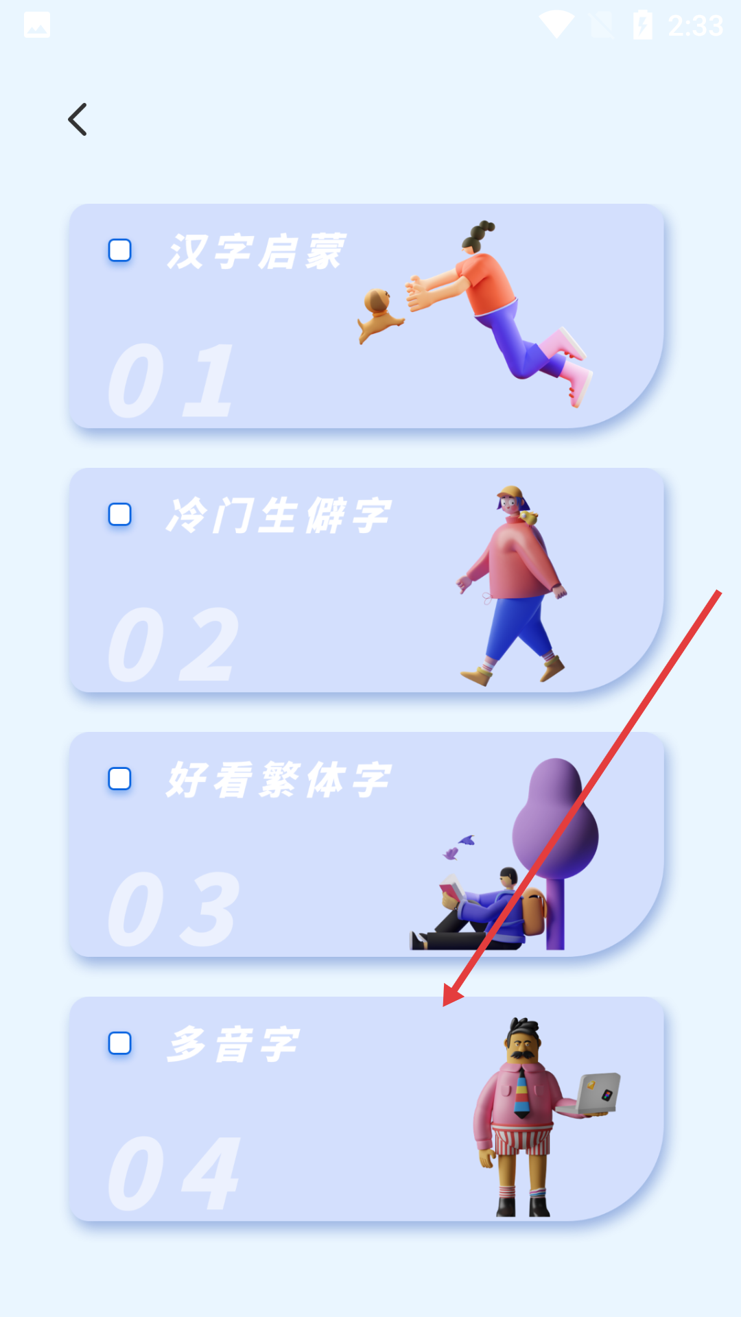 2、在认字分类页面,选择【多音字】类别,进入多音字的学习模块。