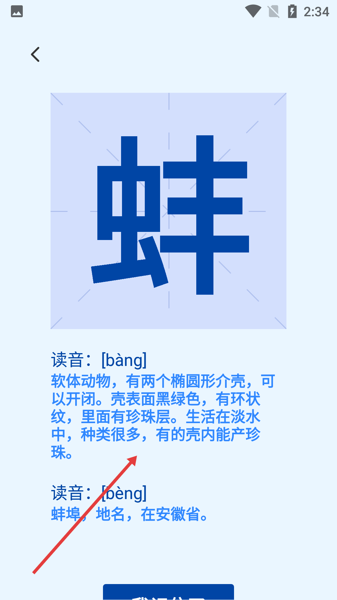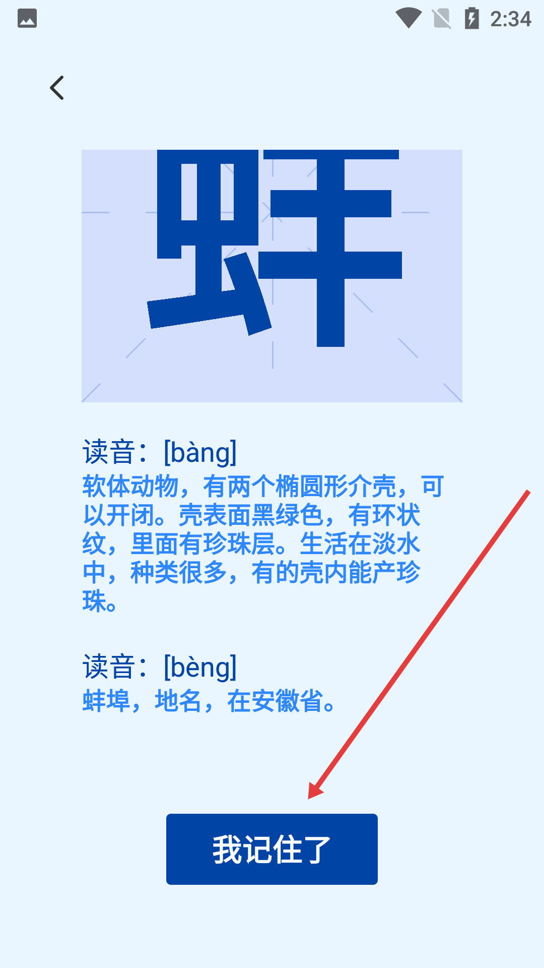4、学完【蚌】字后,点击【我记住了】按钮,完成该汉字的学习记录。