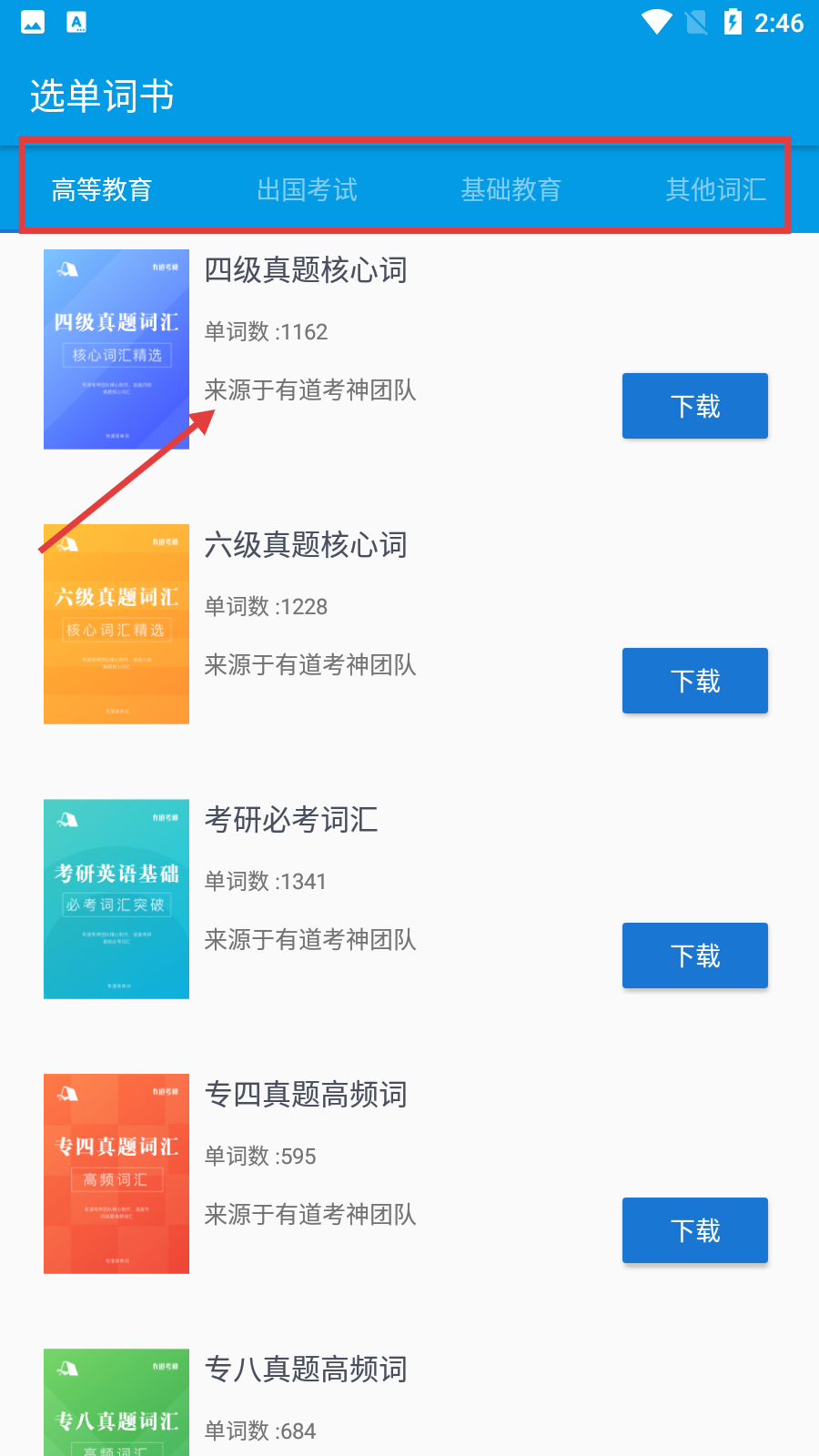 1、进入【选单词书】界面,在【高等教育】【出国考试】等分类中,找到目标单词书,点击右侧【下载】。