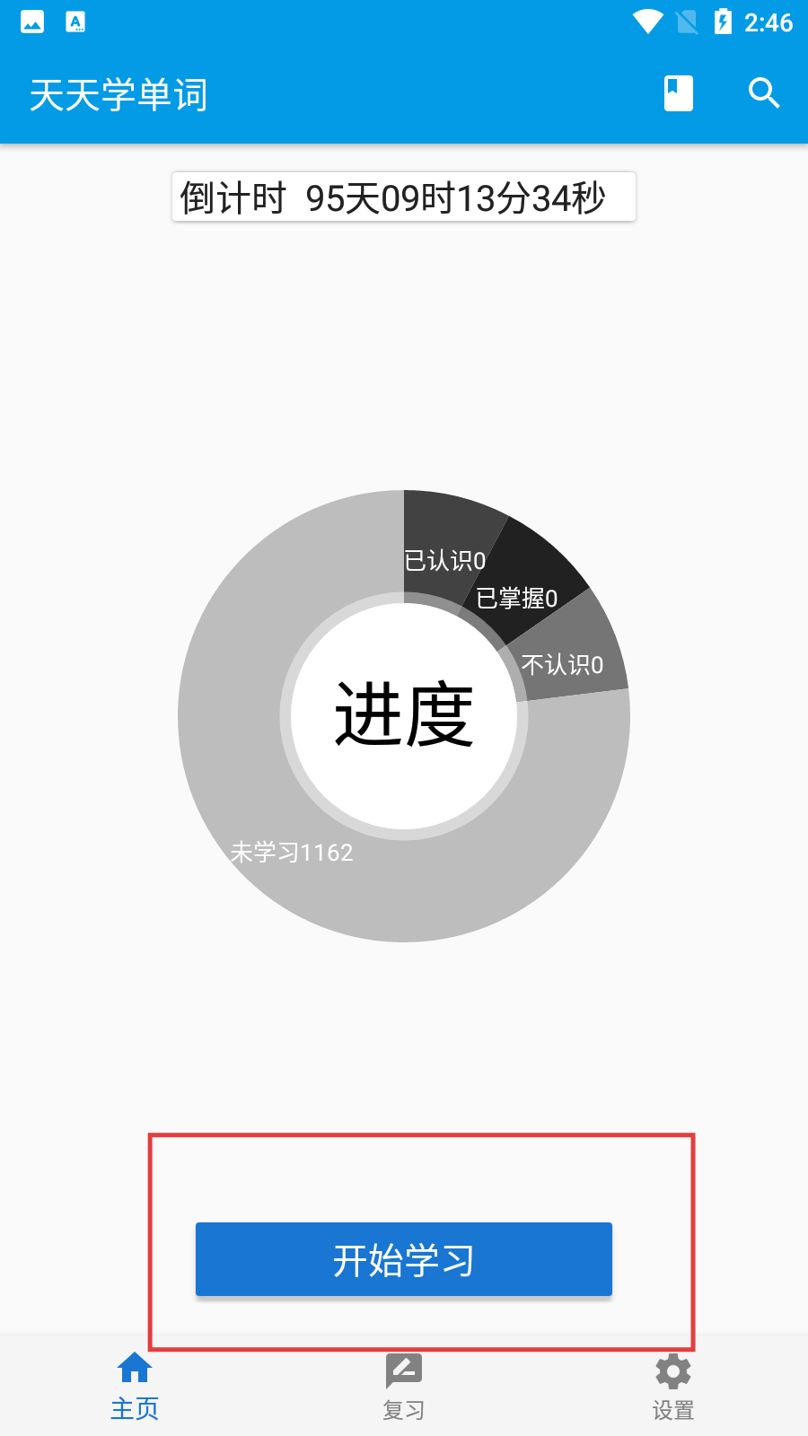 2、下载单词书后进入【天天学单词】主页,查看学习倒计时与进度,点击【开始学习】。