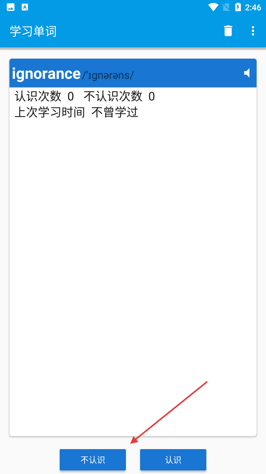3、进入【学习单词】界面,看到单词【ignorance】,根据对单词的熟悉程度,点击【不认识】或【认识】。