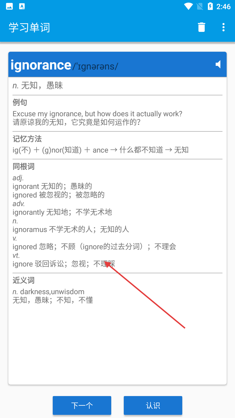 4、若点击【不认识】,可查看该单词的释义、例句、记忆方法、同根词等内容,之后点击【下一个】继续学习新单词。