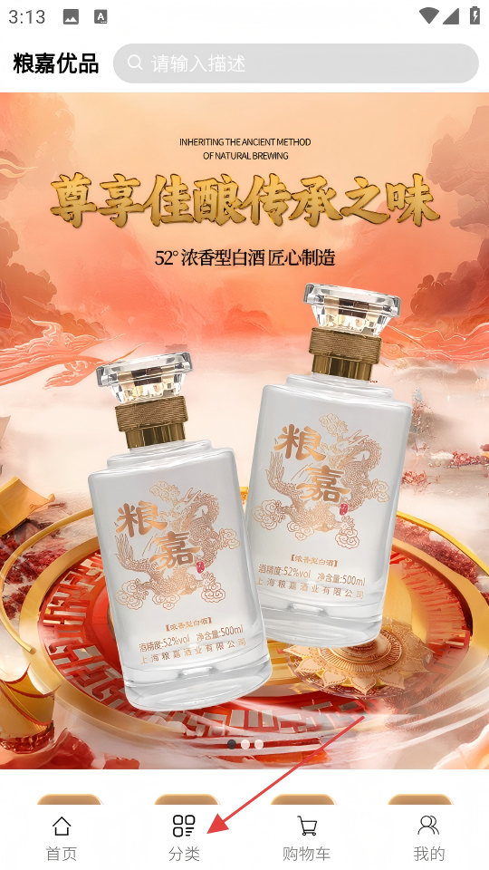1、在“粮嘉优品”APP首页,点击底部【分类】选项,进入“分类”页面。