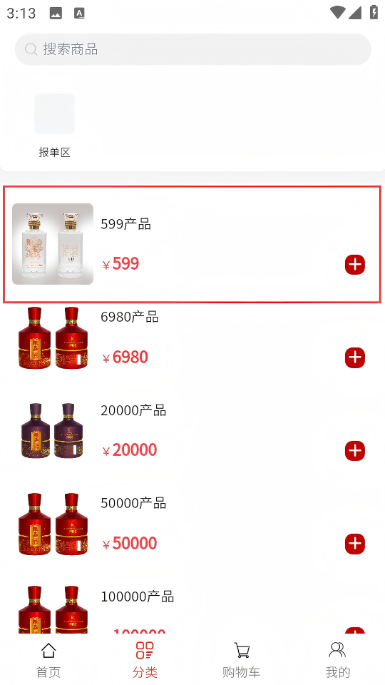2、在“分类”页面,选择“599产品”条目,进入商品详情页面。