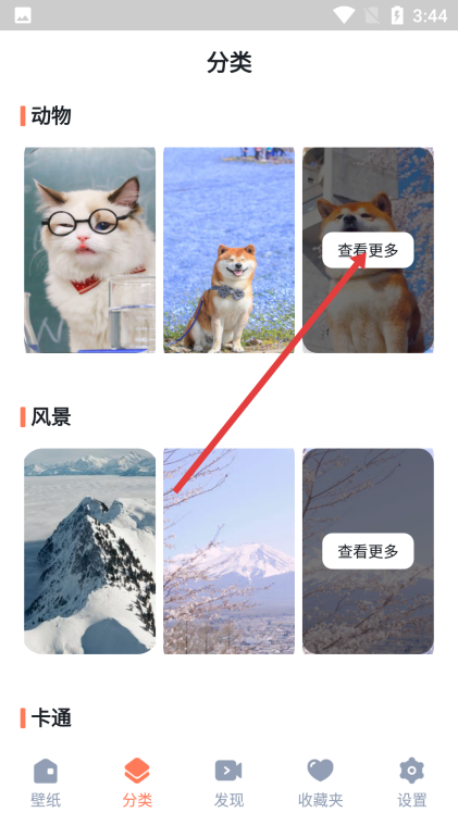 2、在分类页面中,找到【动物】分类下的“查看更多”并点击,进入动物类壁纸展示页。