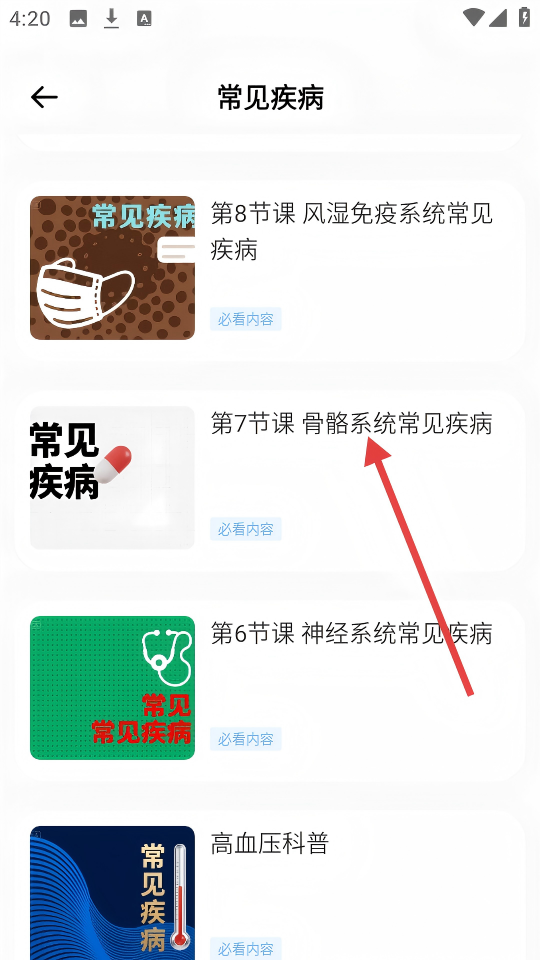 3、在常见疾病列表中,点击【第7节课骨骼系统常见疾病】,进行学习。