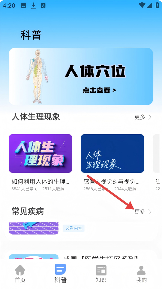 2、在科普页面,点击【常见疾病】右侧的更多,查看更多常见疾病内容。