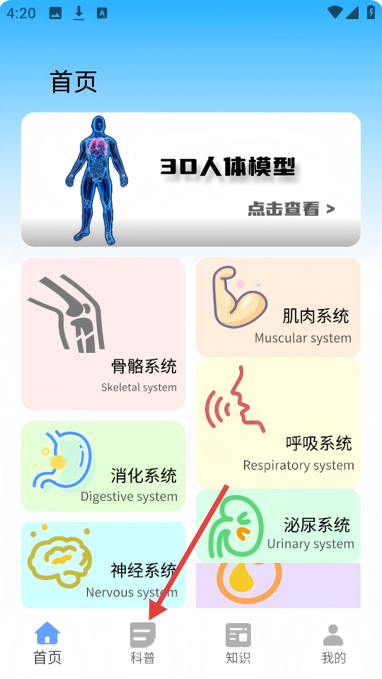 1、在首页点击底部【科普】按钮,进入科普页面。