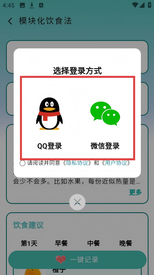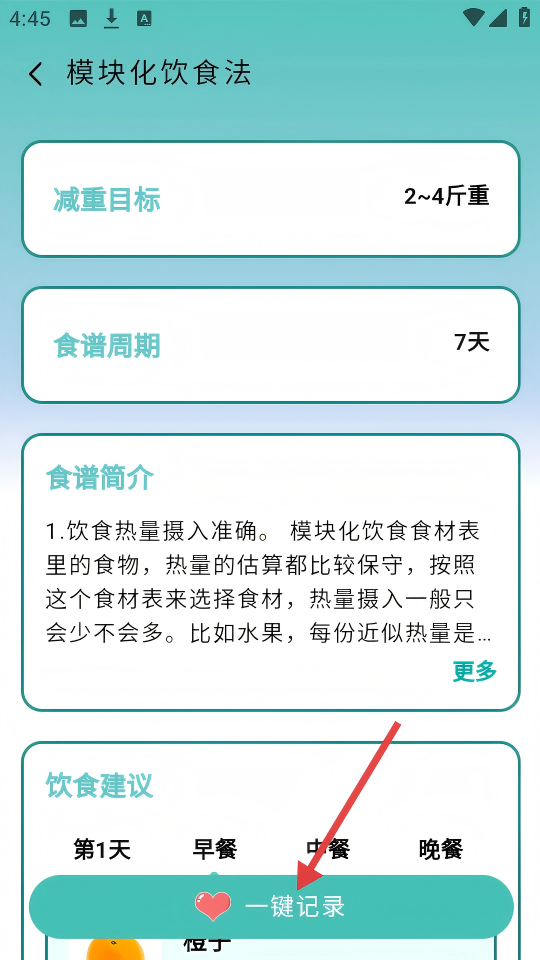 3、进入模块化饮食法页面后,点击【一键记录】按钮。