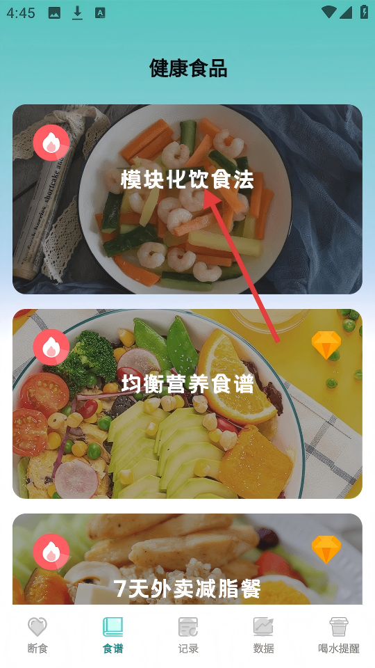 2、进入食谱页面,点击下方【模块化饮食法】选项。