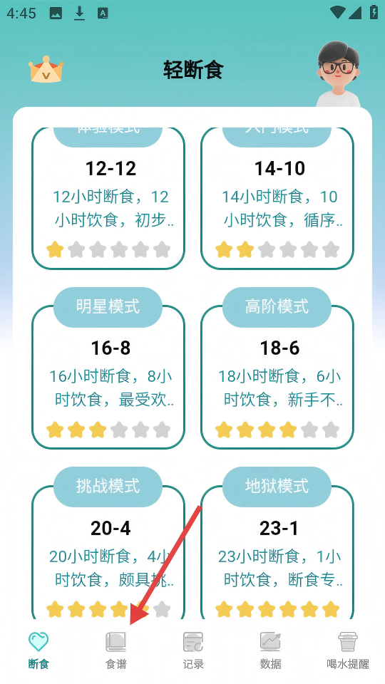 1、在轻断食页面,点击底部【食谱】按钮进入食谱页面。