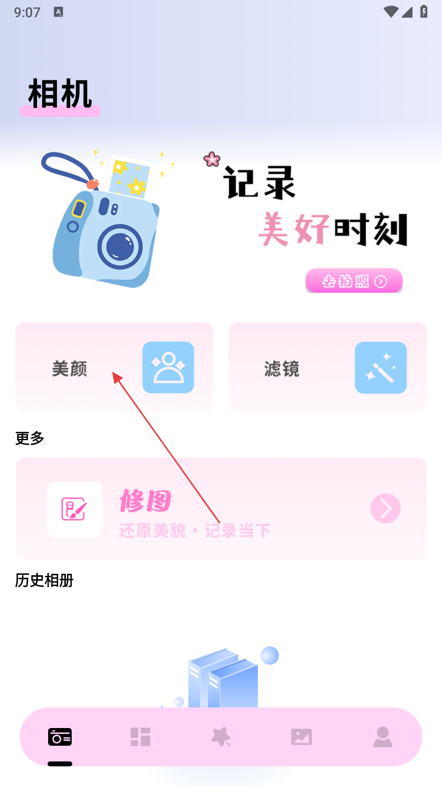 1、在相机界面,点击【美颜】选项,进入图片选择页面。