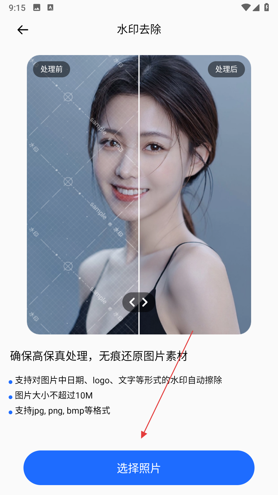 2、在水印去除页面,点击【选择照片】按钮,进入图片选择页面。