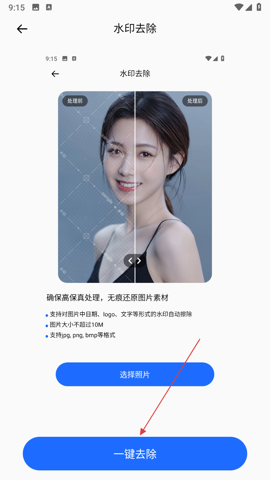 4、图片导入后,点击【一键去除】按钮,即可去除图片中的水印。