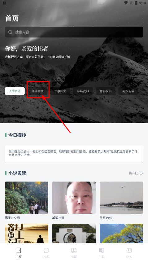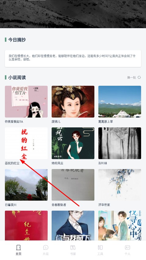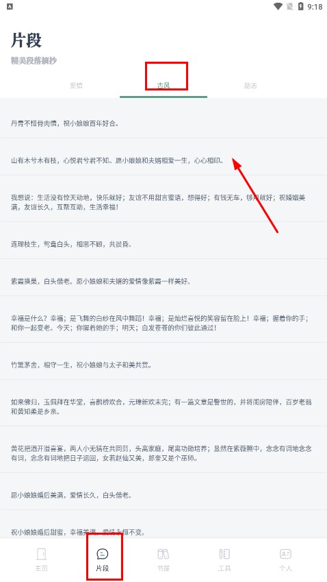 4、点击底部【片段-功能按钮】,进入片段页面,查看精美段落摘抄。
