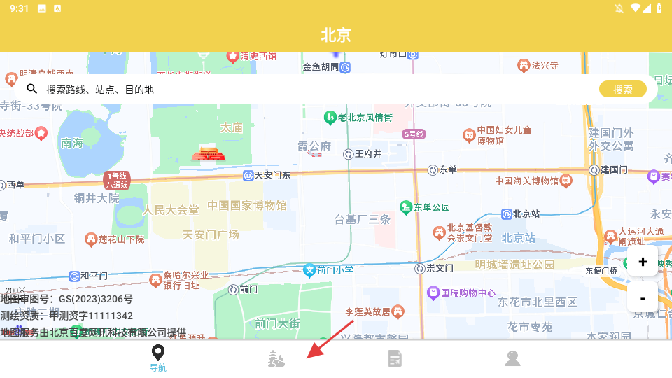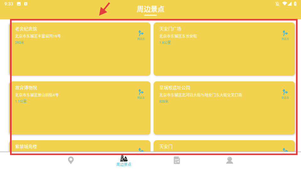 2、进入“周边景点”页面,可查看老舍纪念馆、天安门广场、故宫博物院等景点的位置与距离信息。