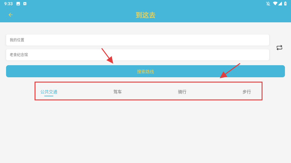 3、选定目标景点(如老舍纪念馆),进入“到这去”页面,点击“搜索路线”,并可选择公共交通、驾车、骑行、步行等出行方式。