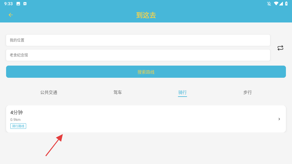 4、若选择“骑行”方式,会显示骑行所需时长及距离,便于规划前往景点的行程。
