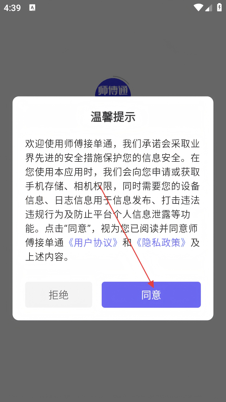 1、打开【师傅接单通】APP,在温馨提示框点击【同意】,进入应用。