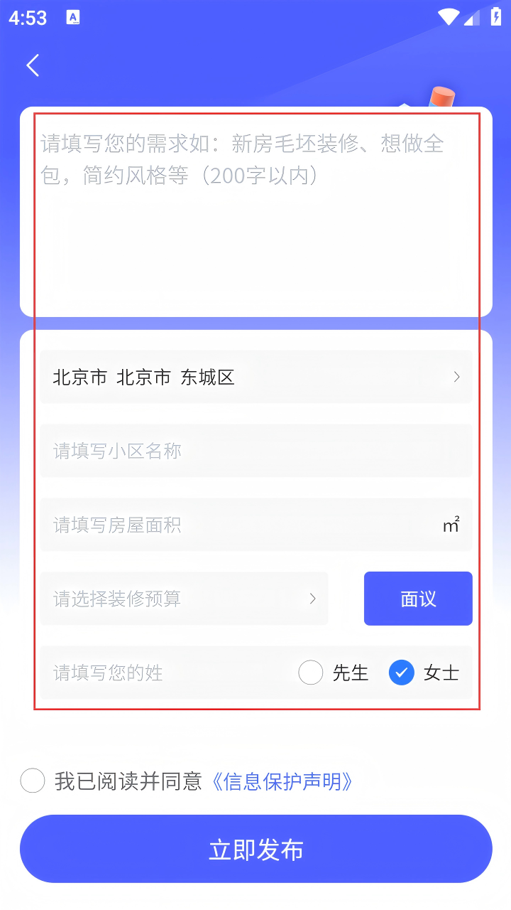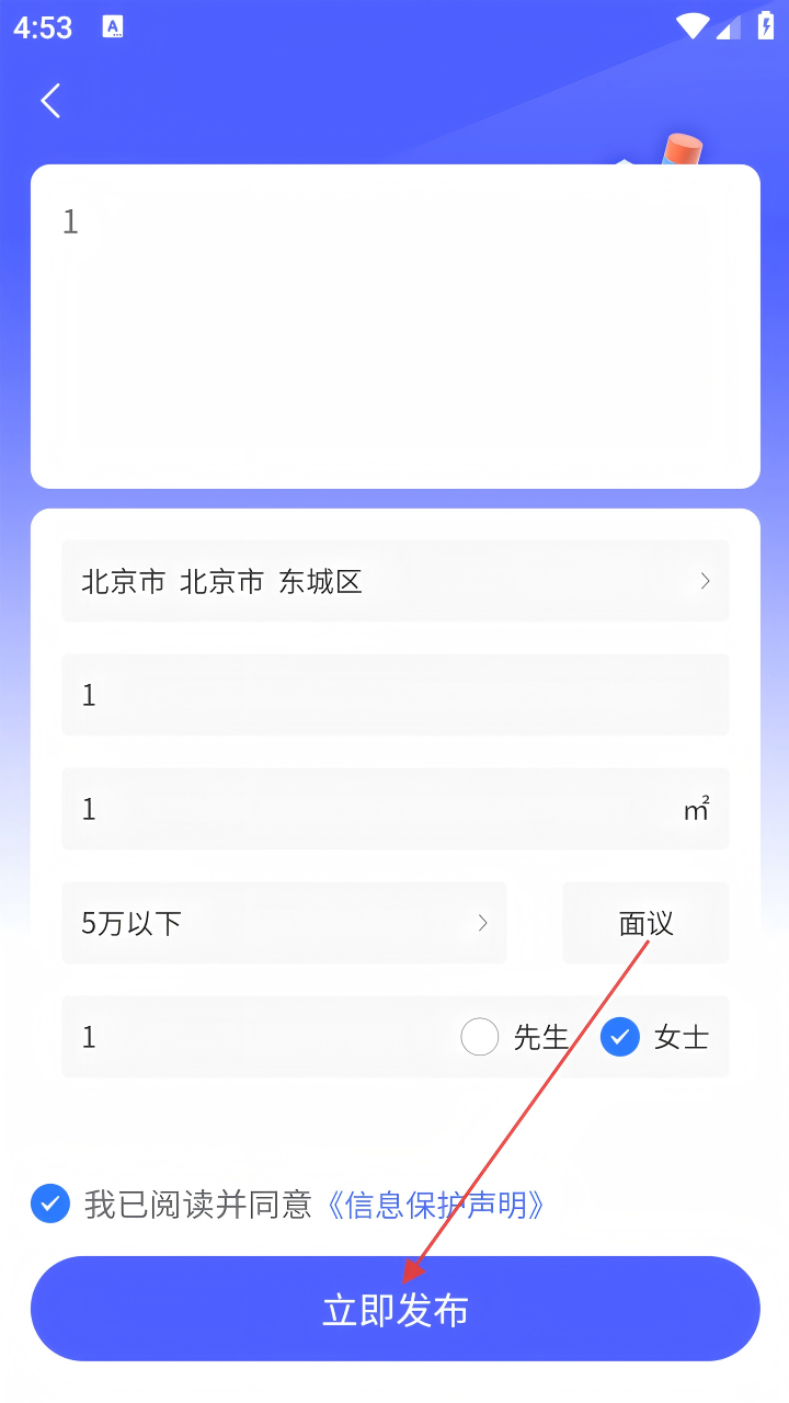 4、填写完信息,勾选【我已阅读并同意《信息保护声明》】,点击【立即发布】。