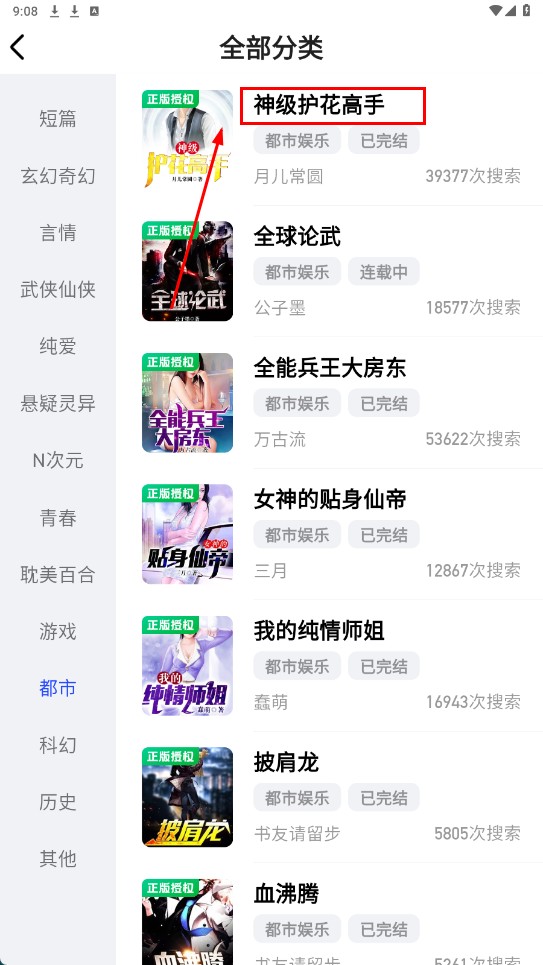2、在全部分类页面,找到【神级护花高手-小说名称】并点击,进入阅读页。