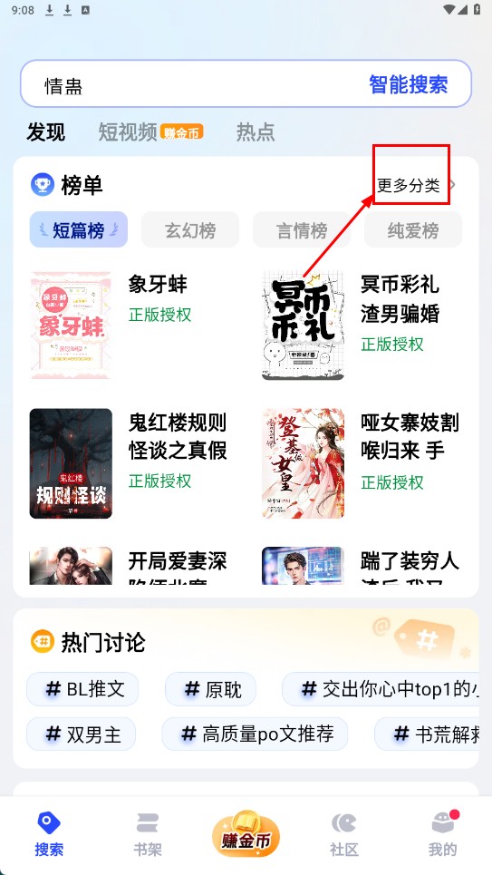 1、点击【更多分类-功能按钮】,进入全部分类页面,选择想看的小说类别。