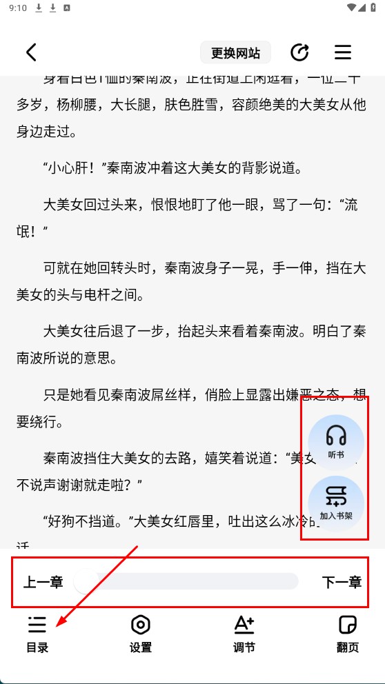 3、阅读时,可点击【听书】【加入书架】,也能通过【上一章】【下一章】切换章节,还可点【目录】查看章节列表。