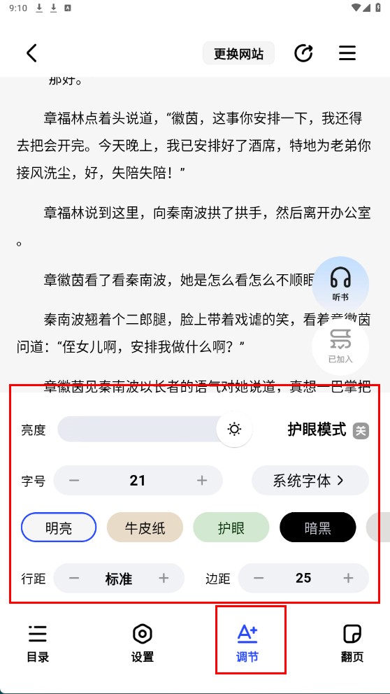 4、点击【调节-功能按钮】,可调整亮度、字号、背景等阅读设置,优化阅读体验。