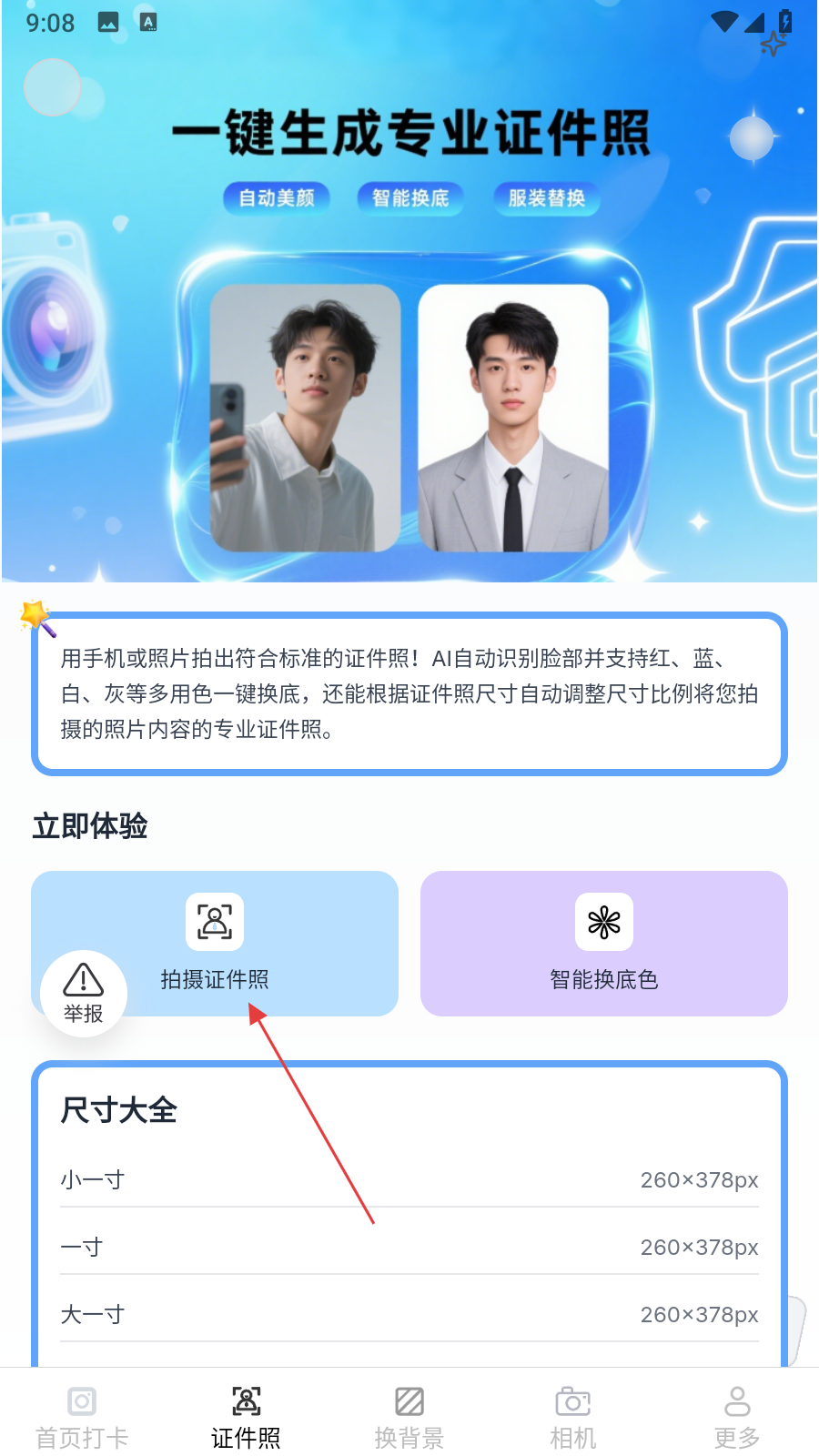 1、在首页,点击底部【证件照】选项,进入证件照功能页面。