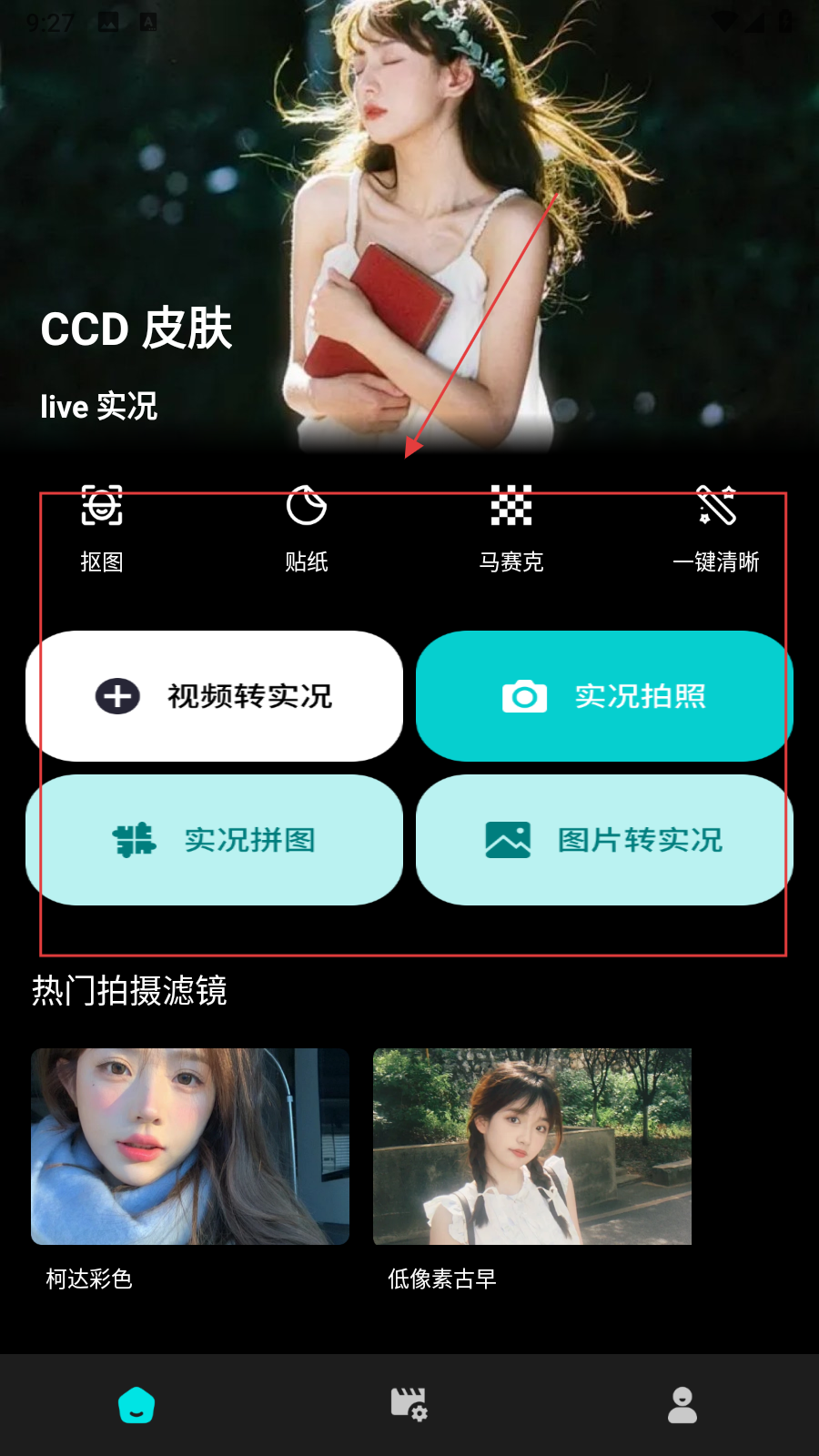 1、进入主界面,【有抠图、贴纸】等功能,还能【视频转实况、实况拍照】,搭配热门滤镜,轻松打造心仪效果。