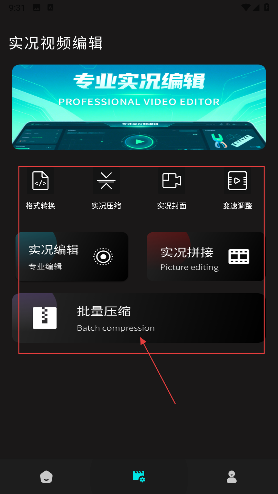 3、来到实况视频编辑界面,可进行【格式转换、实况压缩】等操作,也能【专业编辑、拼接实况视频】。
