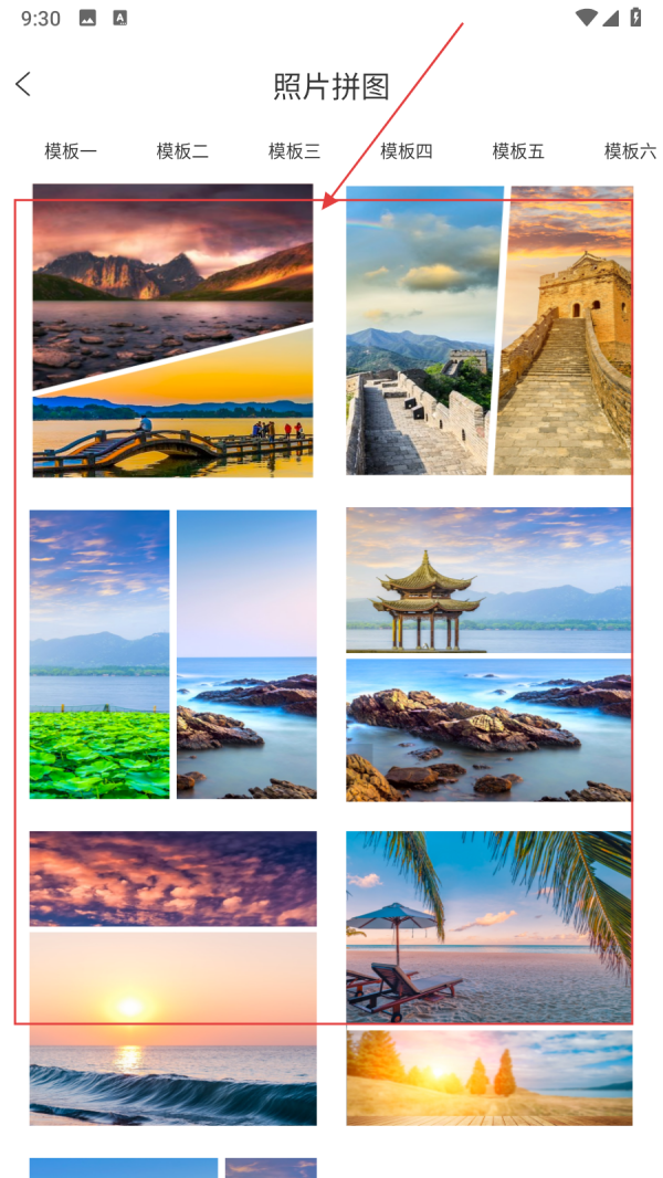 2、在照片拼图界面,有多种拼图模板可选,挑选【喜欢的模板】,就能将照片组合成精美拼图。