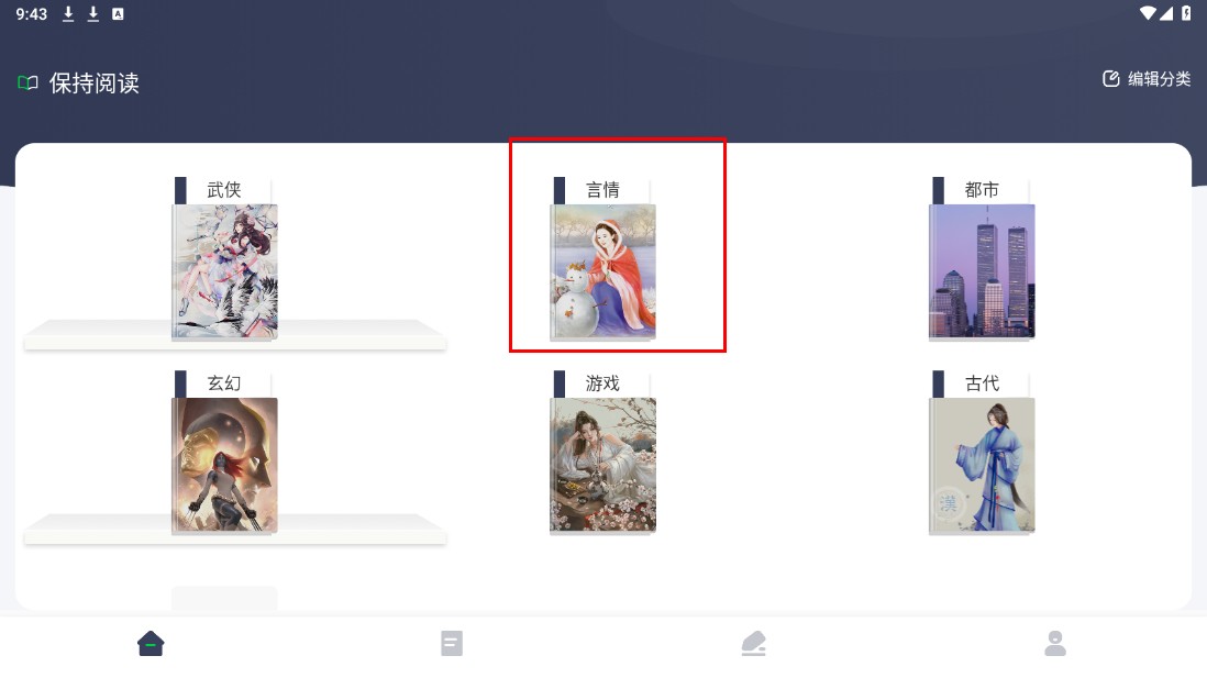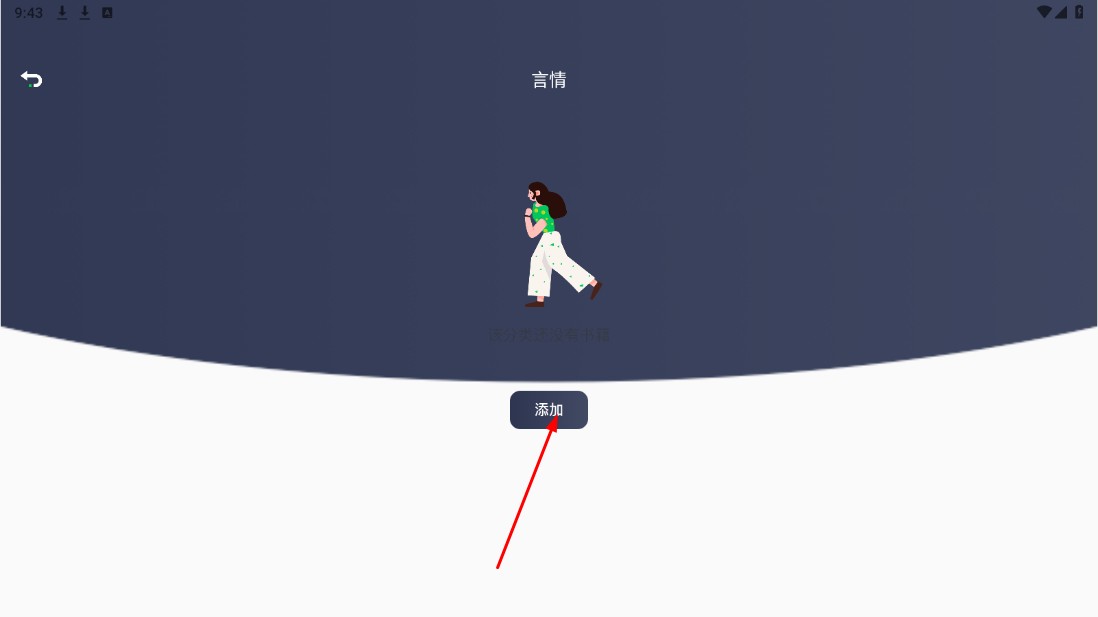 2、在言情分类页面,点击【添加-功能按钮】,进入添加书籍流程。