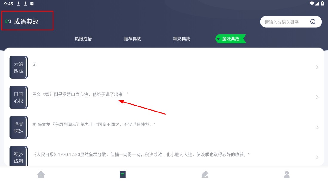 4、切换到【成语典故-功能页面】,可查看“六通四达”“口直心快”等成语典故内容。