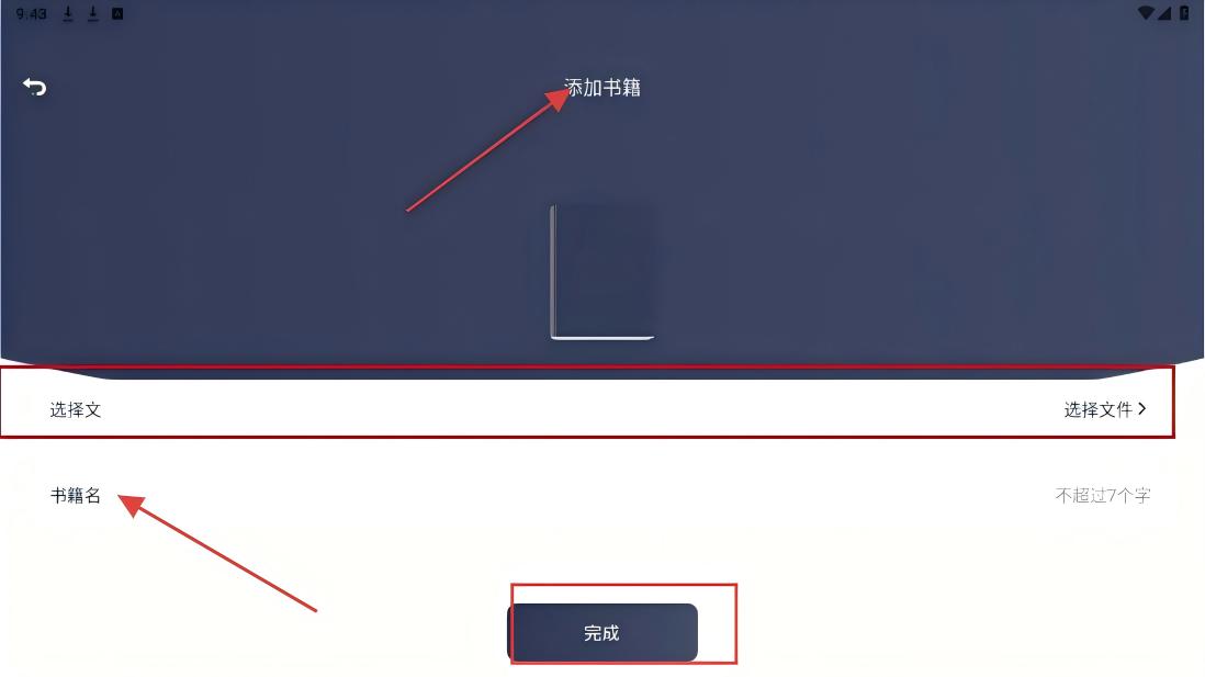 3、在添加书籍页面,点击【选择文件-功能按钮】选文件,填写【书籍名】后,点击【完成-功能按钮】添加书籍。