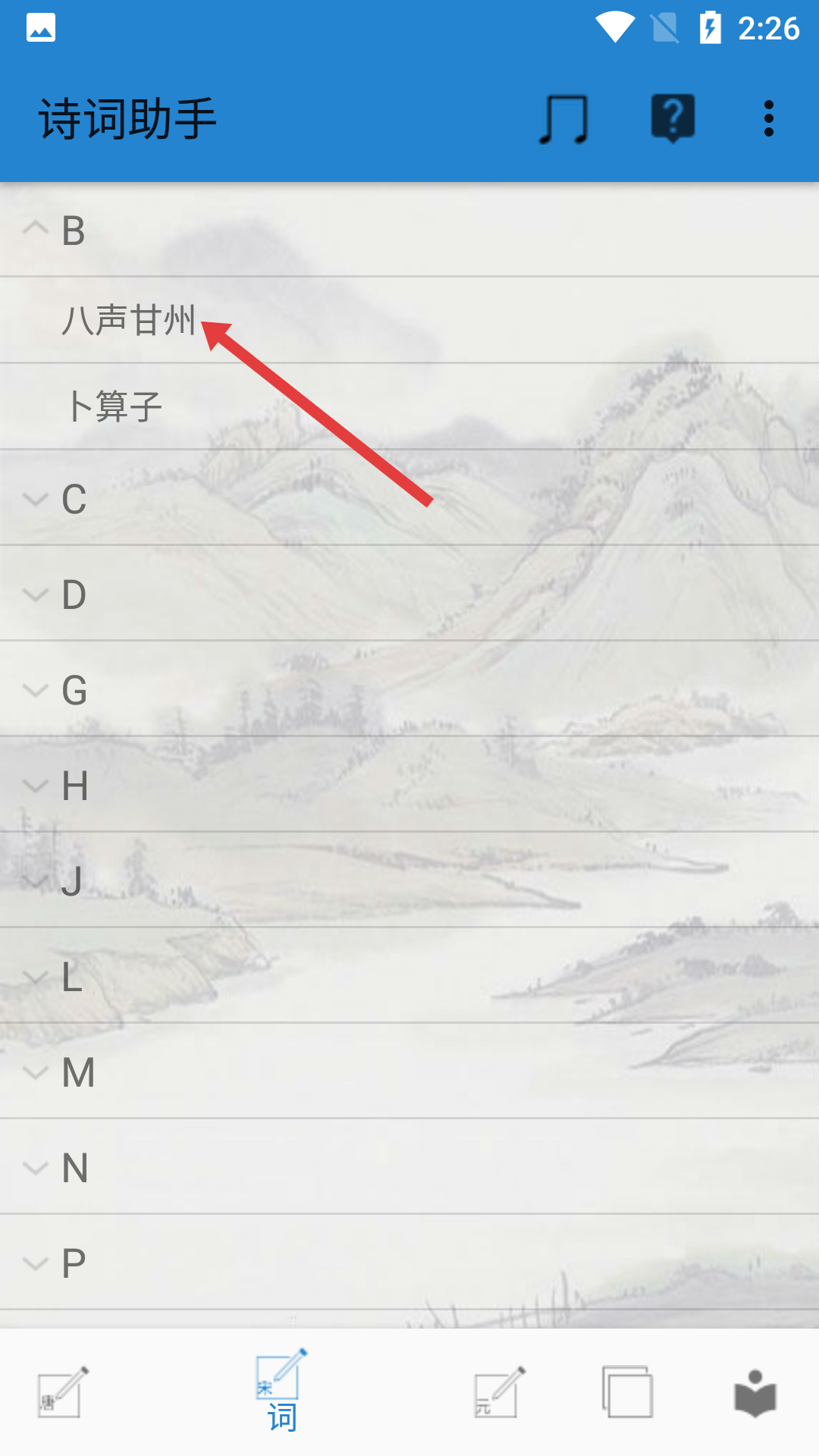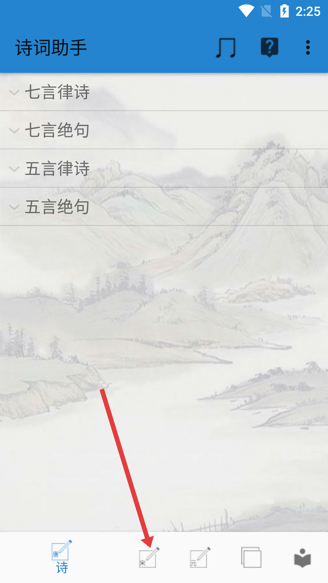 1、进入【诗词助手】后,点击底部标有“宋”的图标,可查看宋代诗词相关内容。