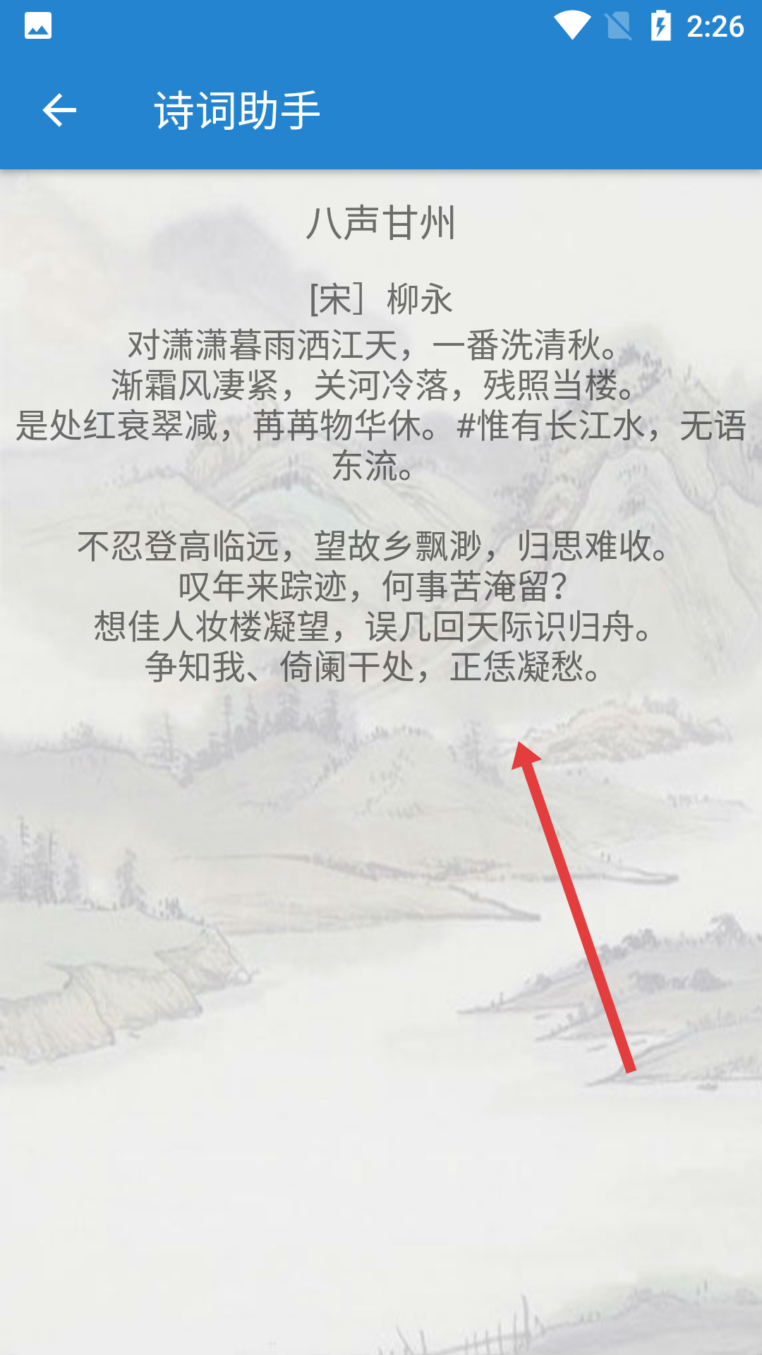 4、学习工具配套完善:内置诗词中生僻字词的注释与读音标注,支持进行全文朗读。