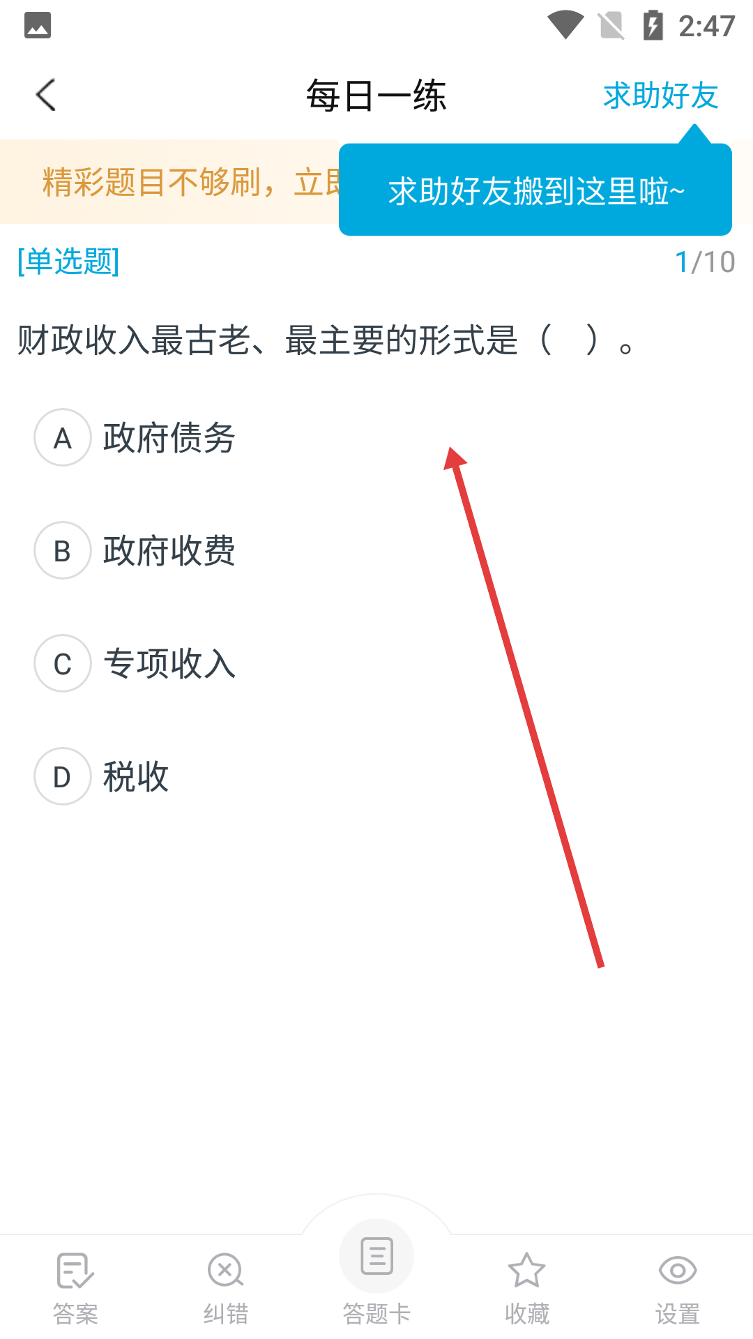 4、进入练习后,即可开始答题。对于“财政收入最古老、最主要的形式是()”,答案为D选项【税收】。