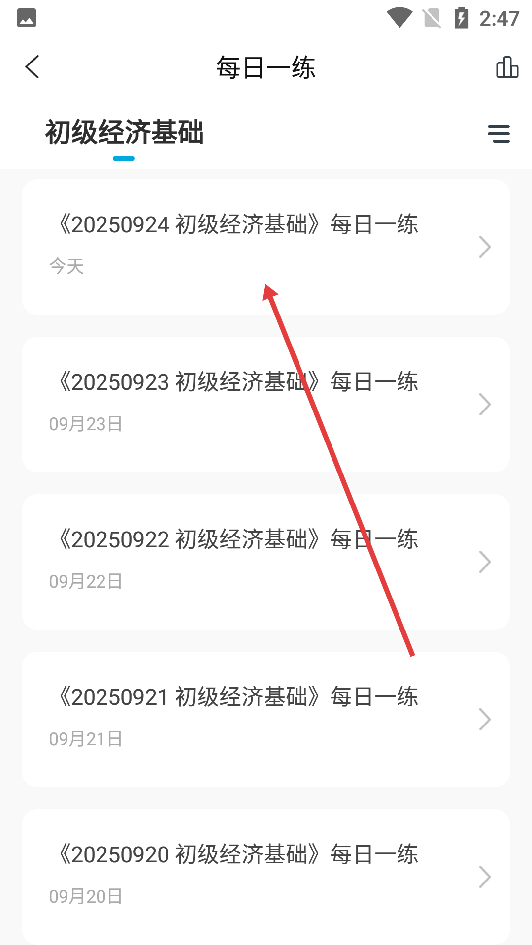 3、在每日一练列表中,选择当天的练习条目(如《20250924初级经济基础》每日一练)。