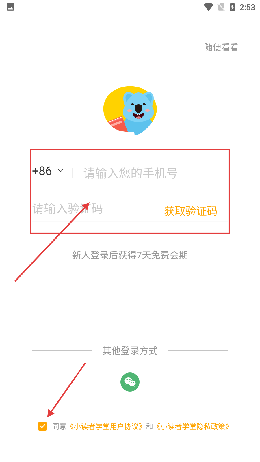 1、进入登录页,勾选【同意-《小读者学堂用户协议》】,输入手机号,点击【获取验证码】,再输入验证码。