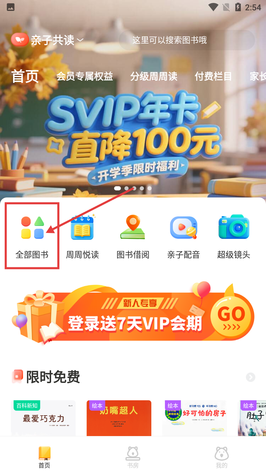 2、登录后到首页,点击【全部图书】,可查看各类图书,还有周周悦读、图书借阅等功能。