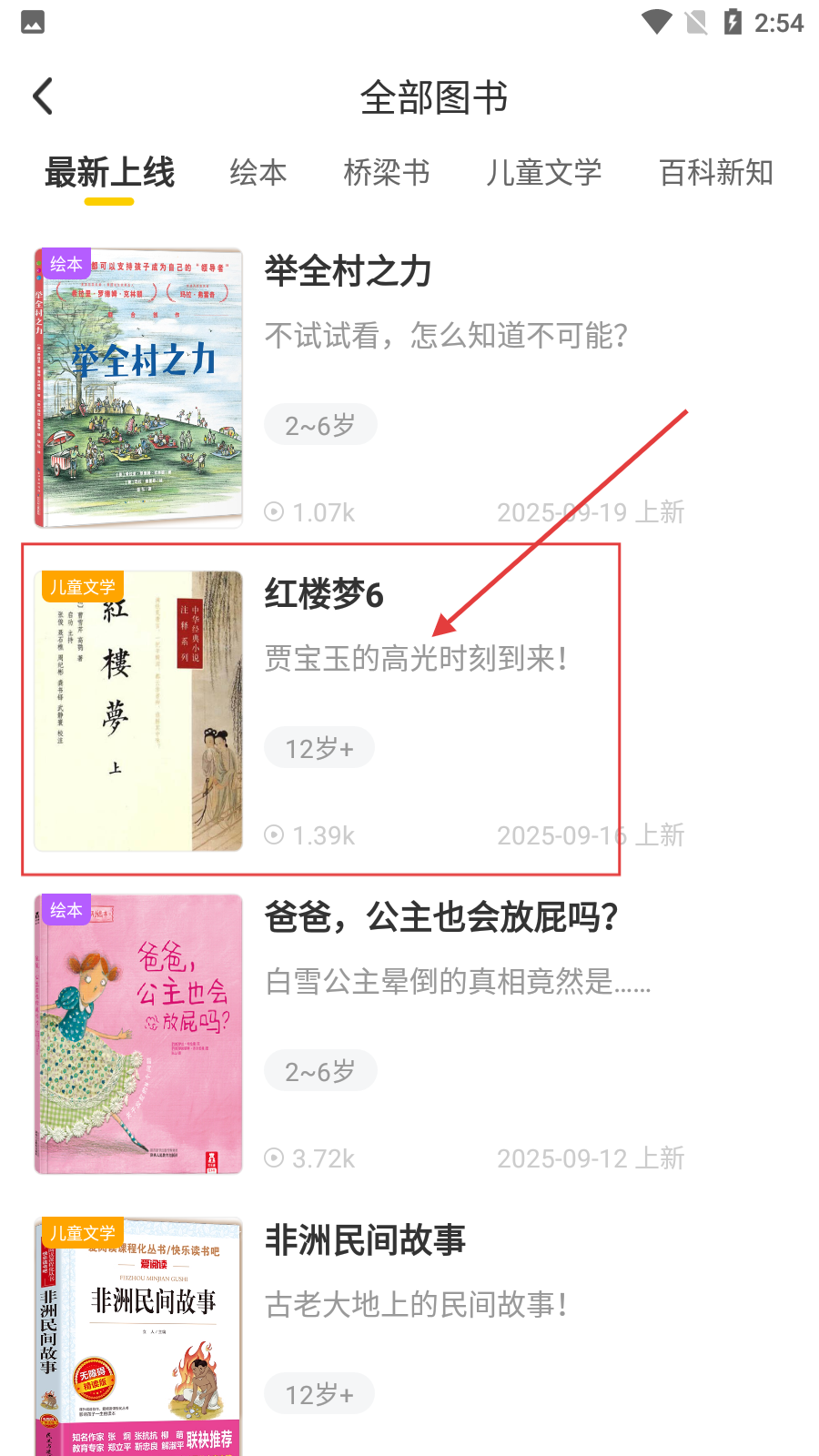 3、在全部图书页,比如:找到【红楼梦6】,它属于儿童文学类,适合12岁+读者,点击可进入详情页。