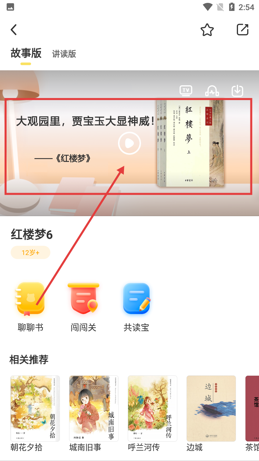 4、进入《红楼梦6》详情页,点击播放按钮,可观看【大观园里,贾宝玉大显神威!-《红楼梦》】相关内容,还有聊聊书、闯闯关等功能。