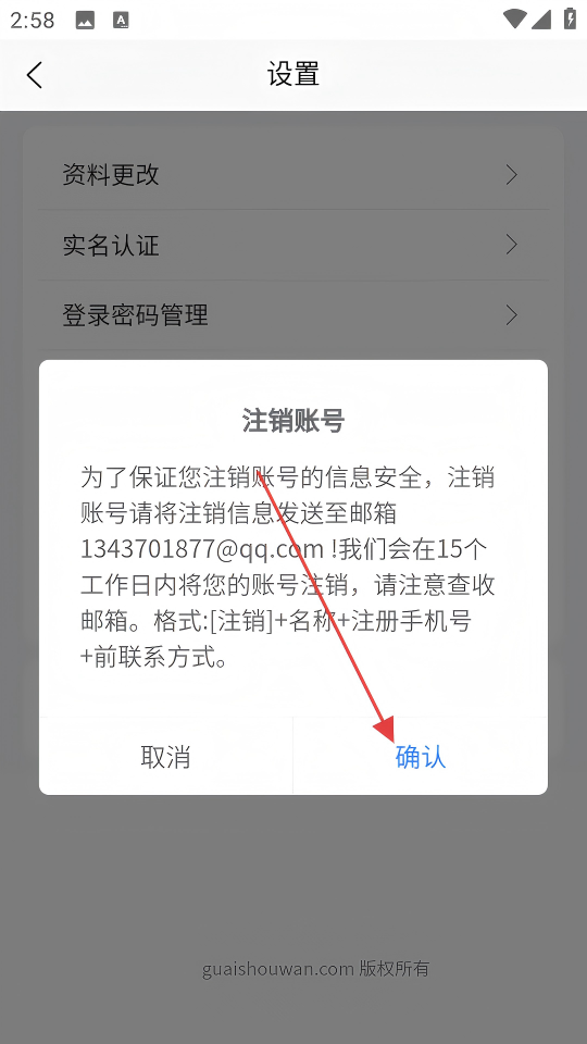4、在弹出的注销账号提示框中,点击【确认】即可申请注销账号。