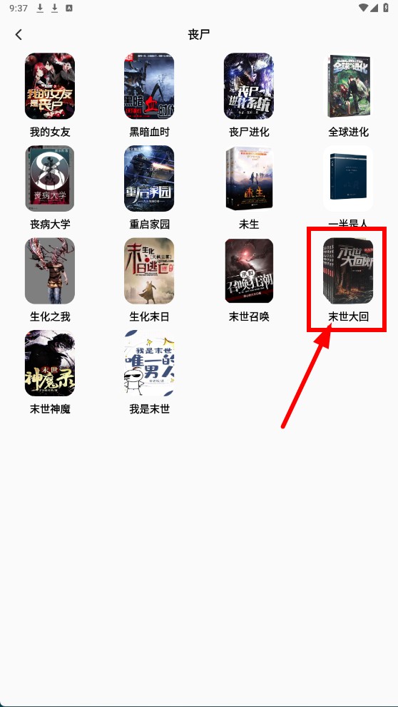 2、在该页面找到【末世大回炉-小说封面】并点击,查看小说详情。