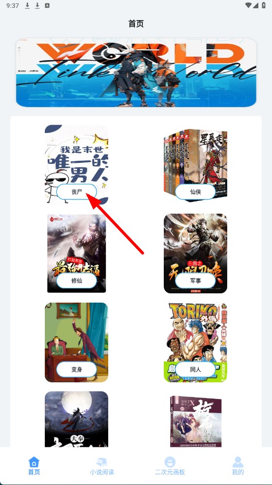 1、在首页点击【丧尸-分类图标】,进入丧尸类小说页面。