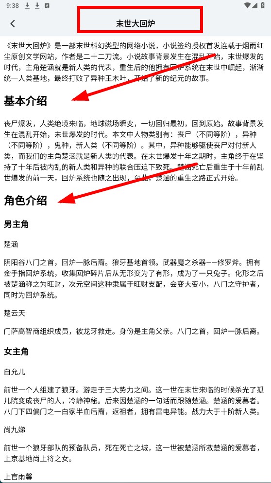 3、进入小说详情页后,可浏览【末世大回炉-基本介绍】【末世大回炉-角色介绍】等内容。