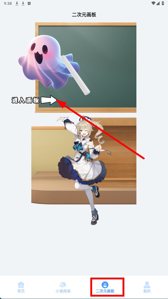 4、点击底部【二次元画板-功能按钮】,再点击【进入画板-功能标识】,进入二次元画板页面。