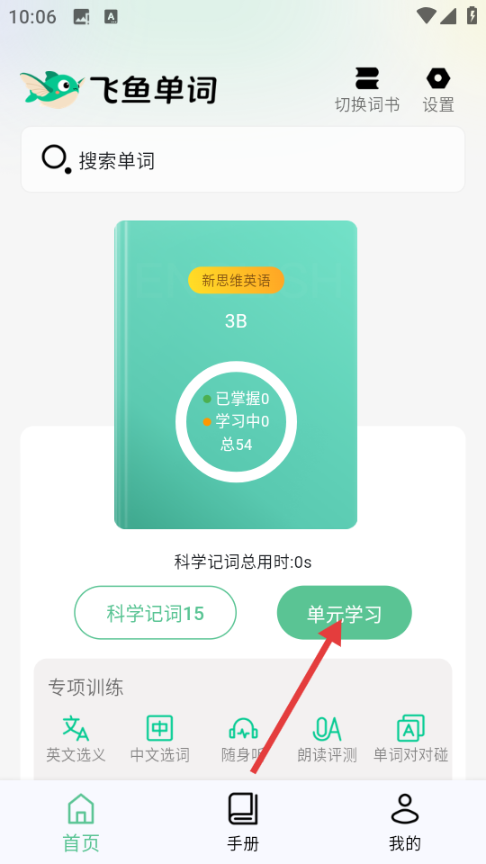 1、在首页中,点击【单元学习】,进入单元单词学习页面。